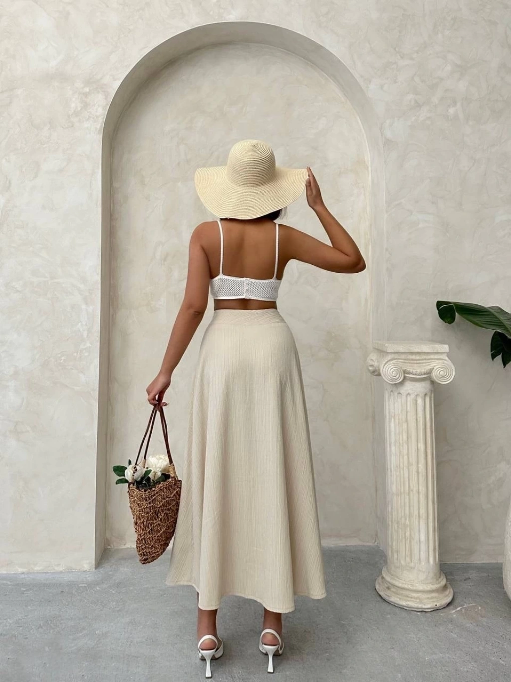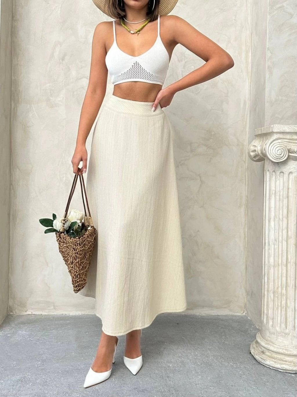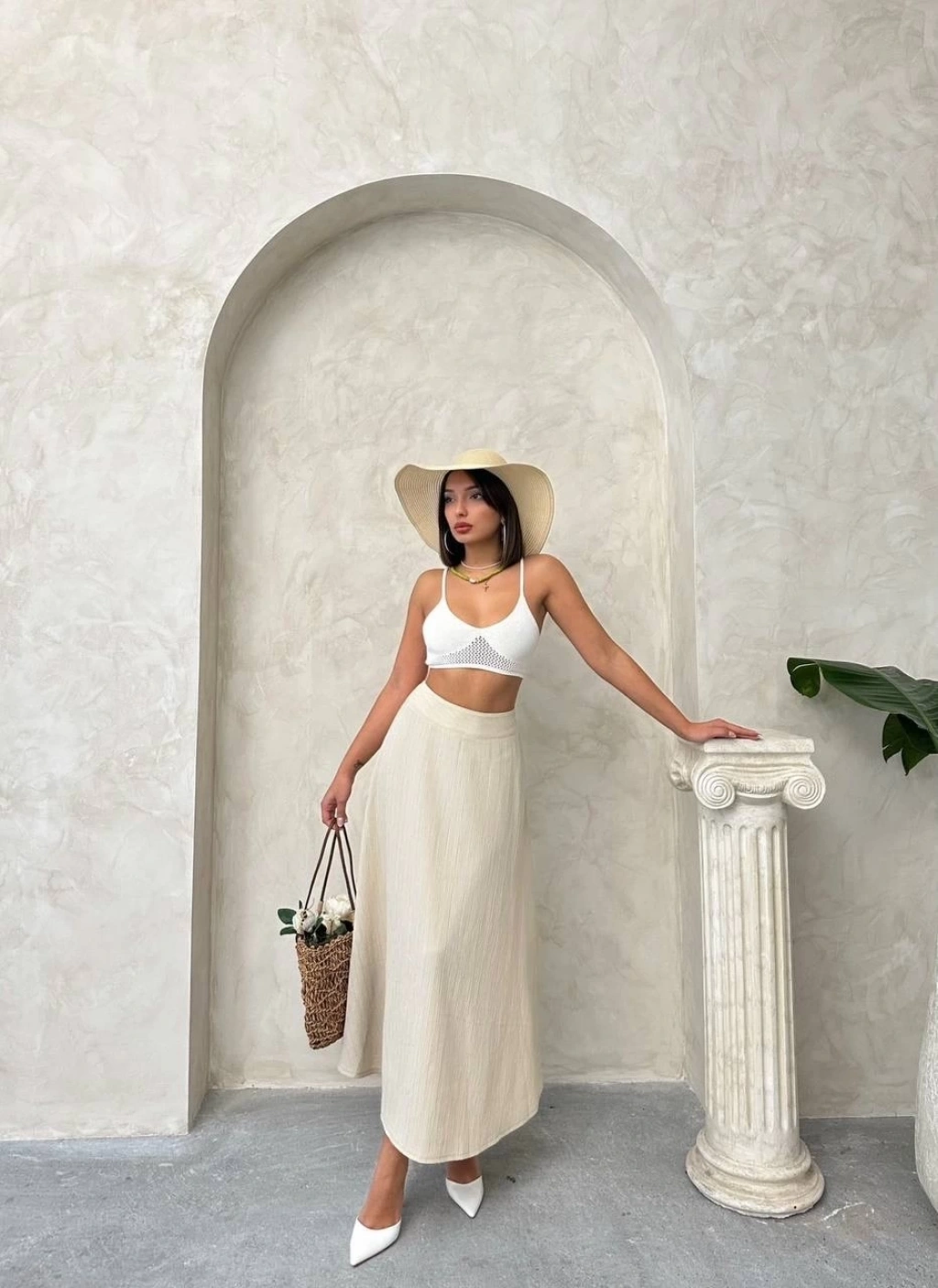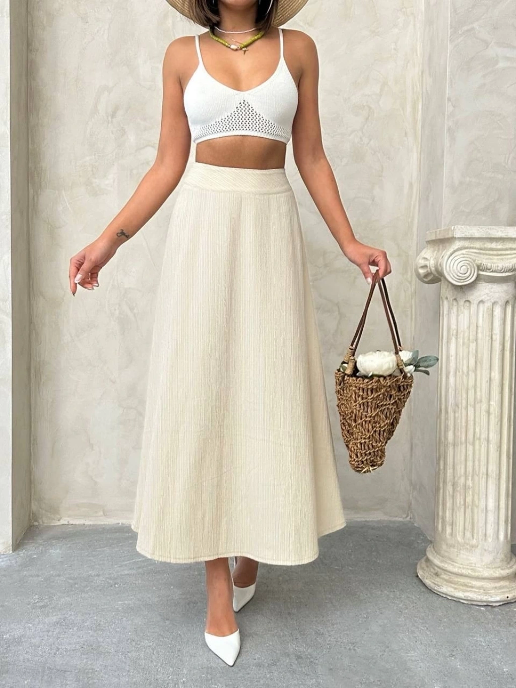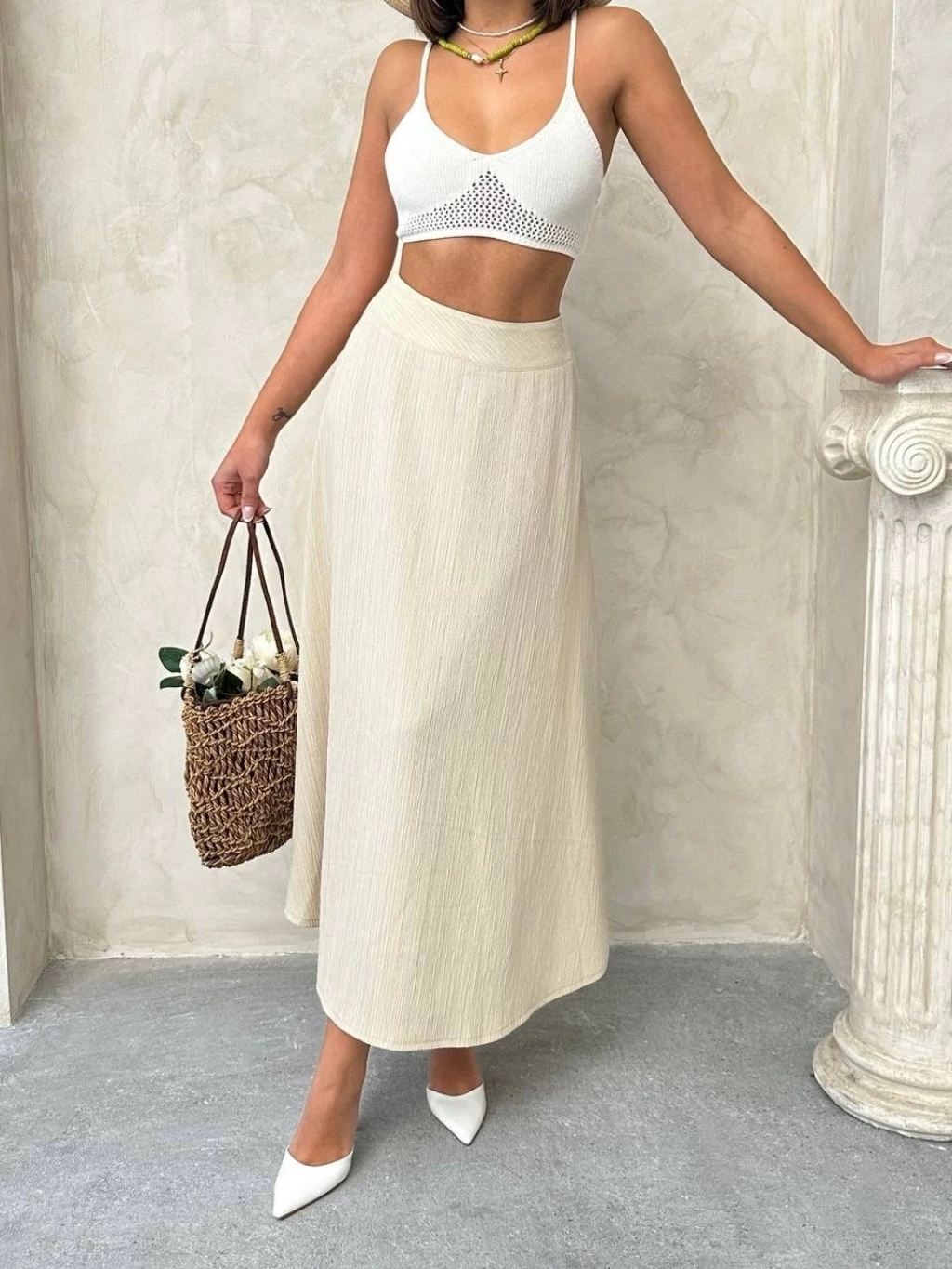 Müslin kumaş keten uzun etek bej pt