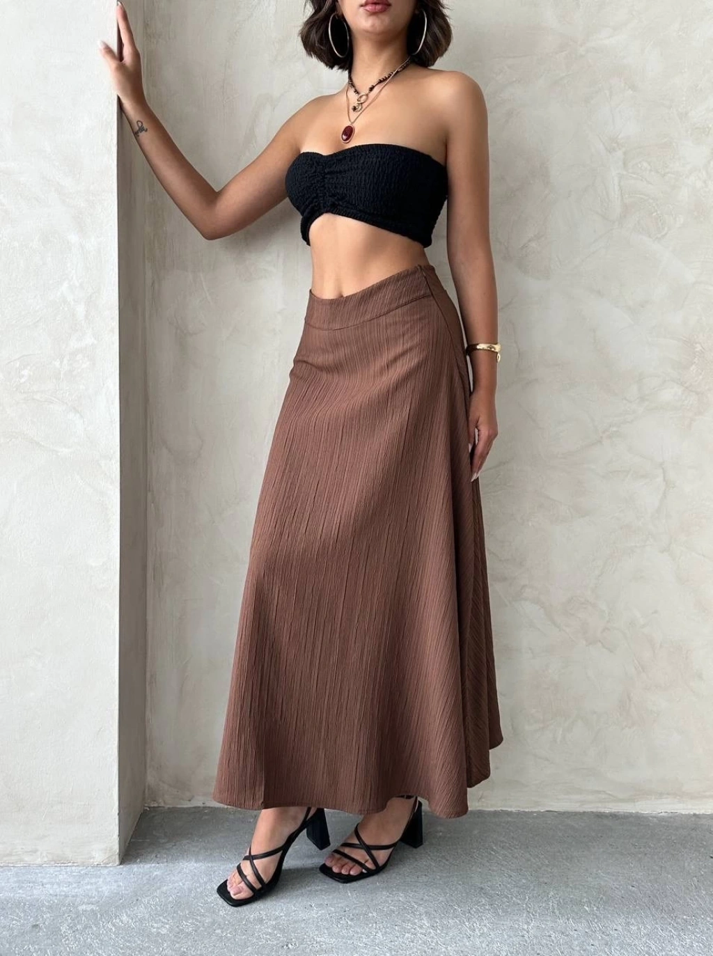 Yıldız baskılı deri etek kahve