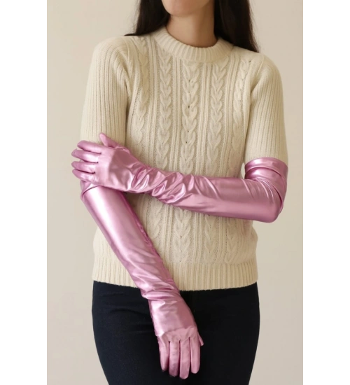 Uzun Boy Ekstra Parlak Saten Eldiven Pembe Renk NessiWorld