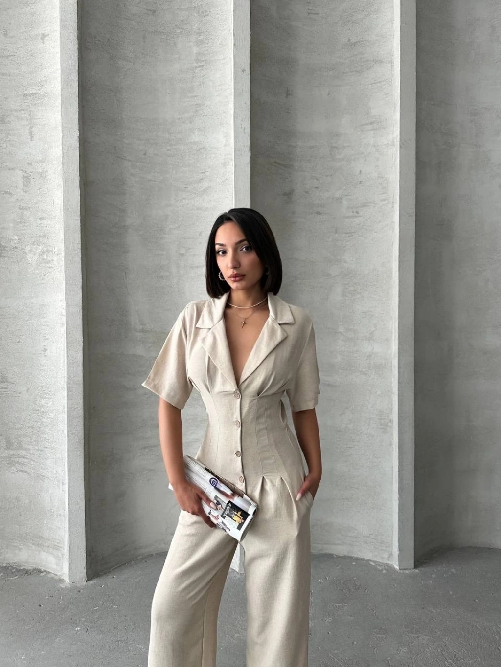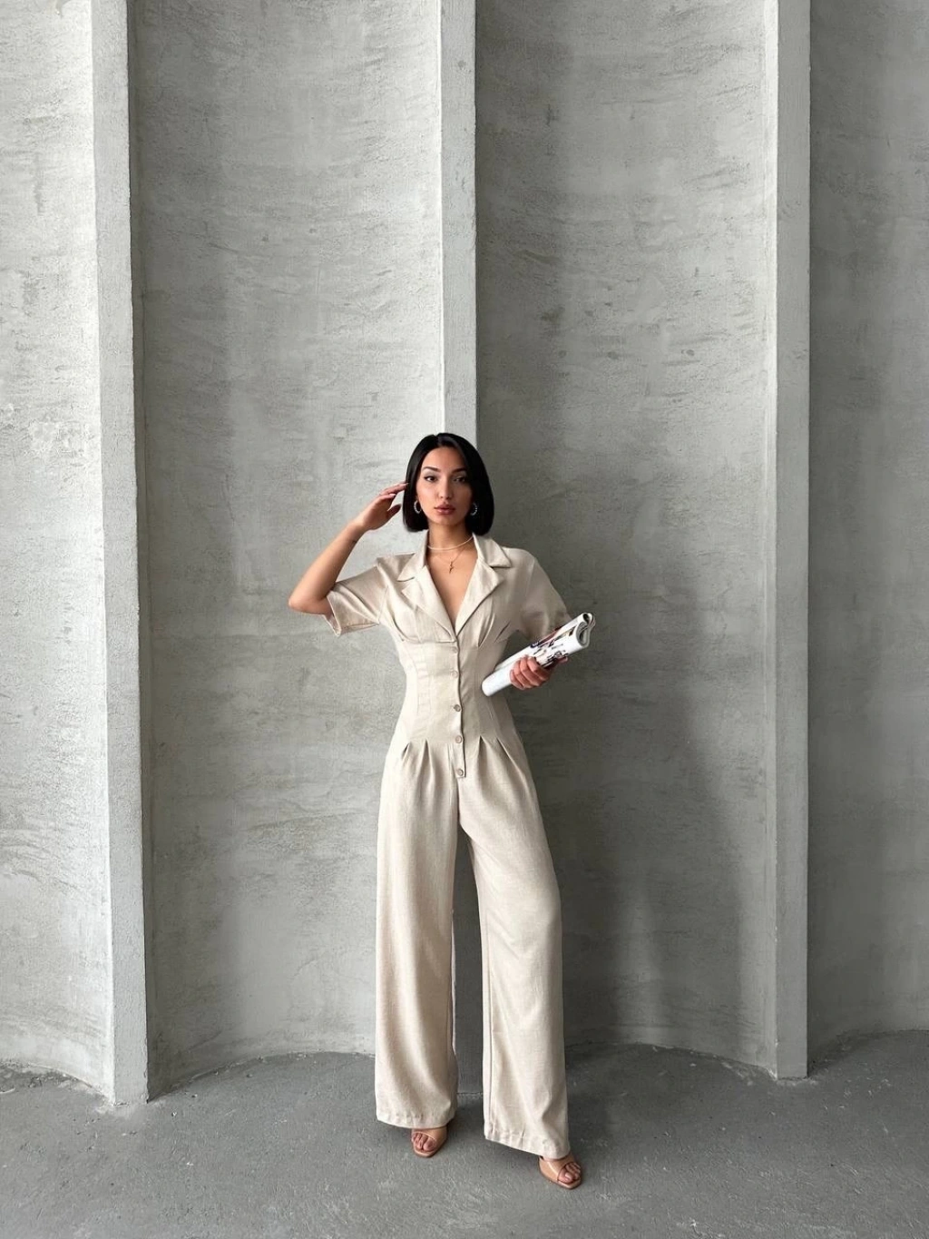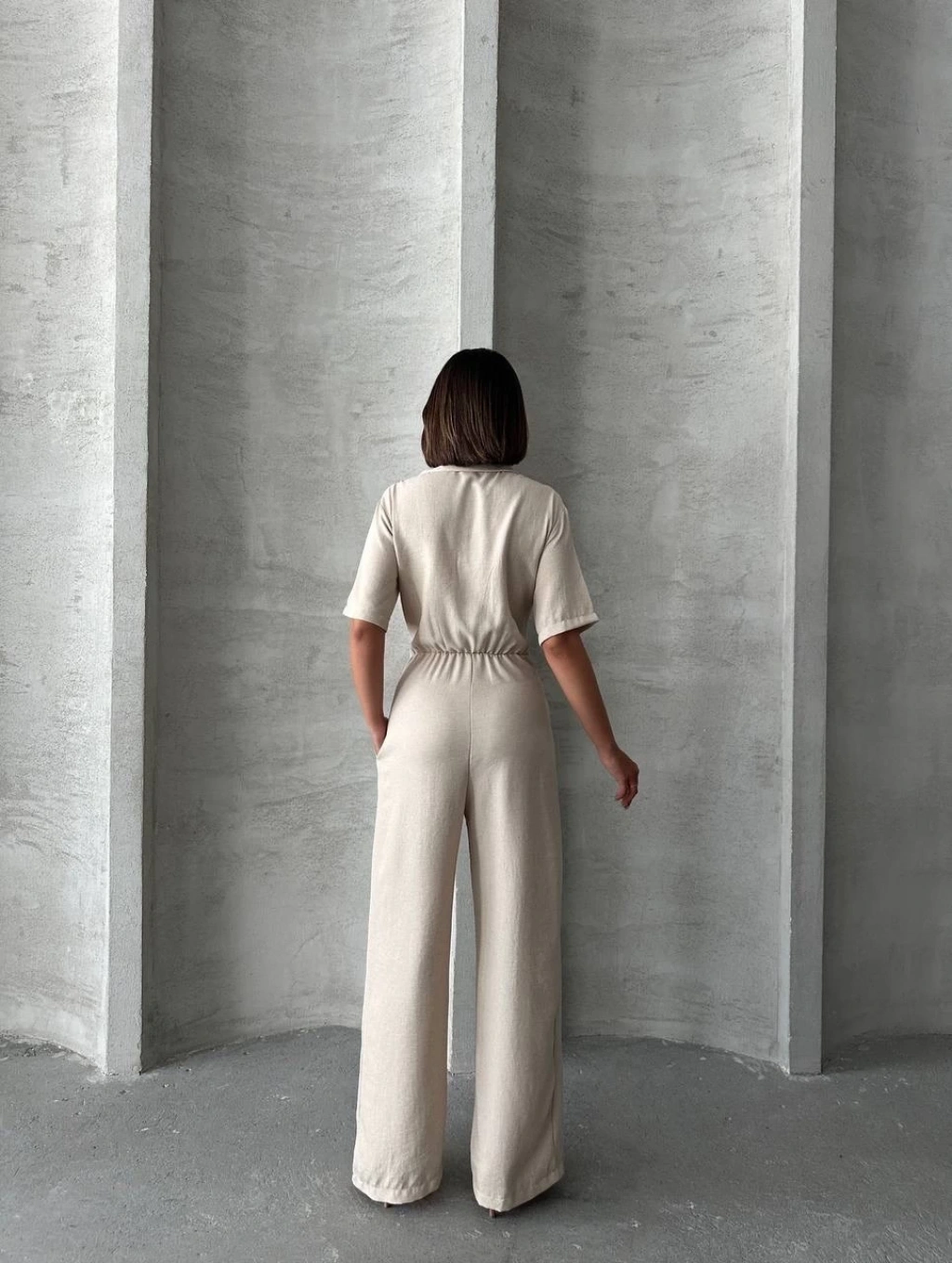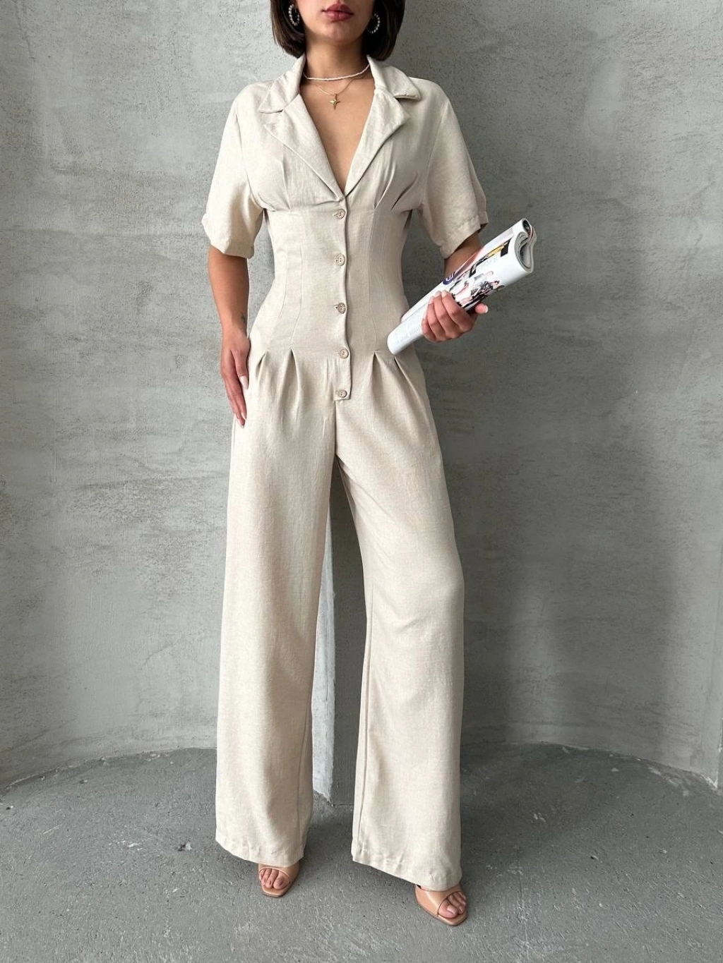 Sırt dekolteli keten beyaz tulum S1036