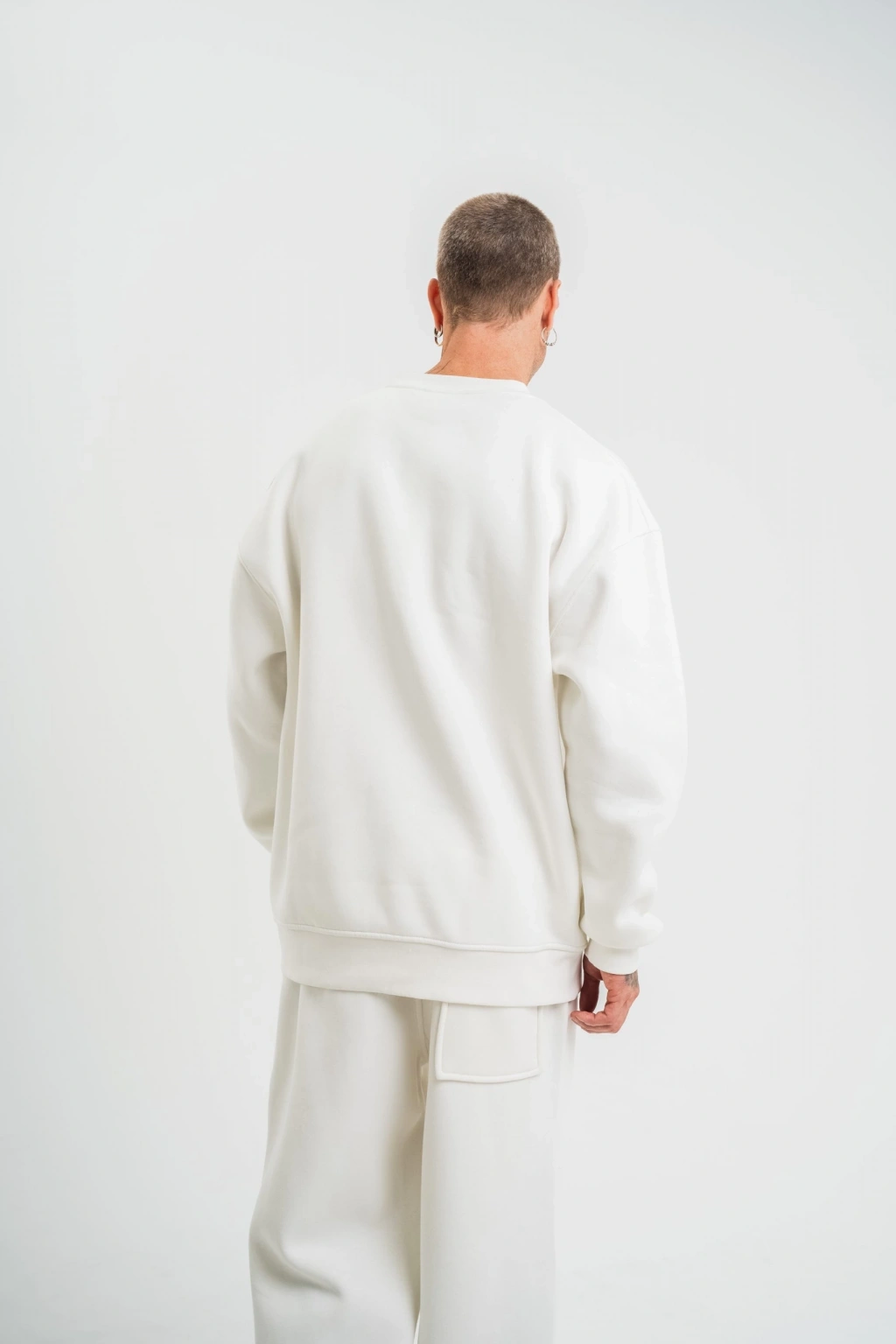 Erkek 3 İplik Pamuklu Yağ Yıkamalı Sweatshirt Double Oversize Bisiklet Yaka Uzun Kol - Krem