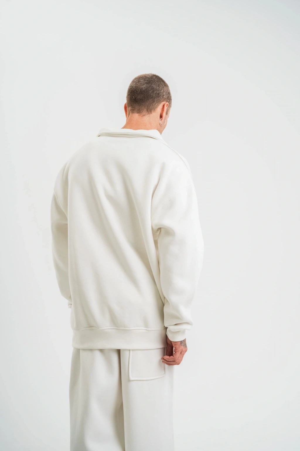 Erkek Oversize Üç İplik Kapüşonlu Sweat – Kol ve Etek Ribana Detaylı, Ön ve Sırt Baskılı, Kanguru Cepli Rahat Kalıp Model - Beyaz