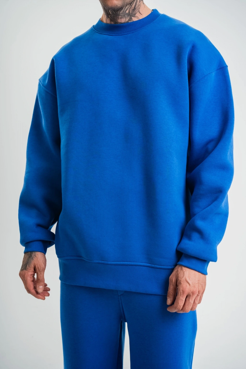 Erkek Patlı Yaka Üç İplik Pamuklu Sweatshirt Double Oversize Rahat Kalıp Günlük Kullanım - Mavi