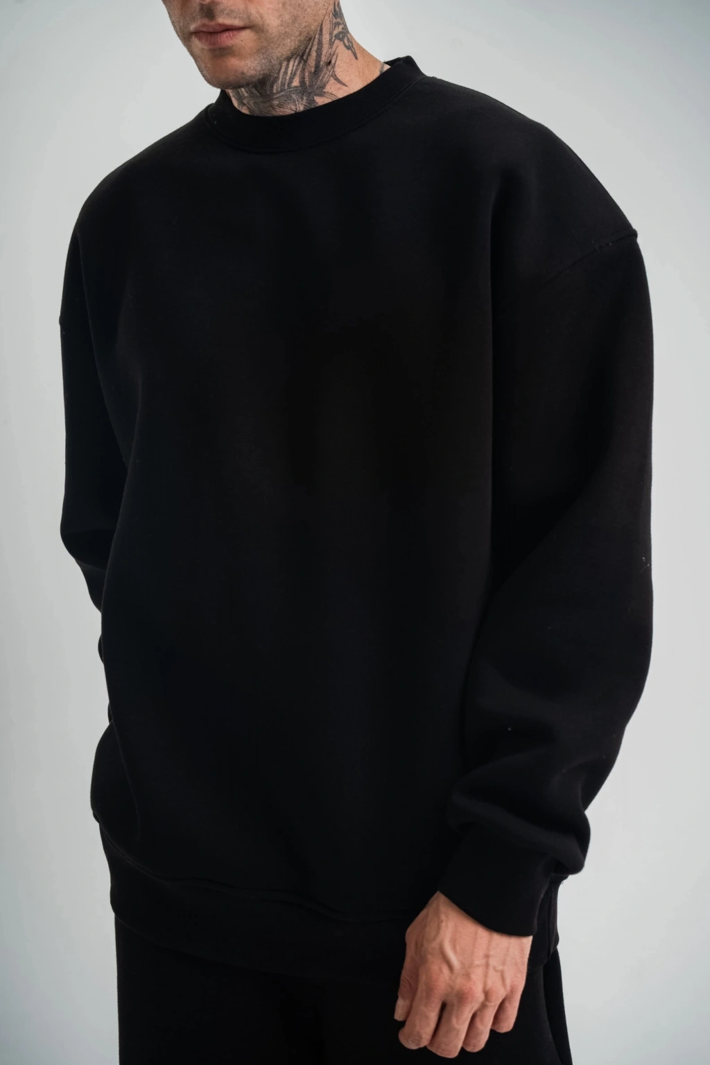 Erkek Oversize Üç İplik Kapüşonlu Sweatshirt – Siyah Sırt ve Ön Baskılı, Kanguru Cepli, Rahat Kalıp, İçi Pamuklu ModeL-Siyah
