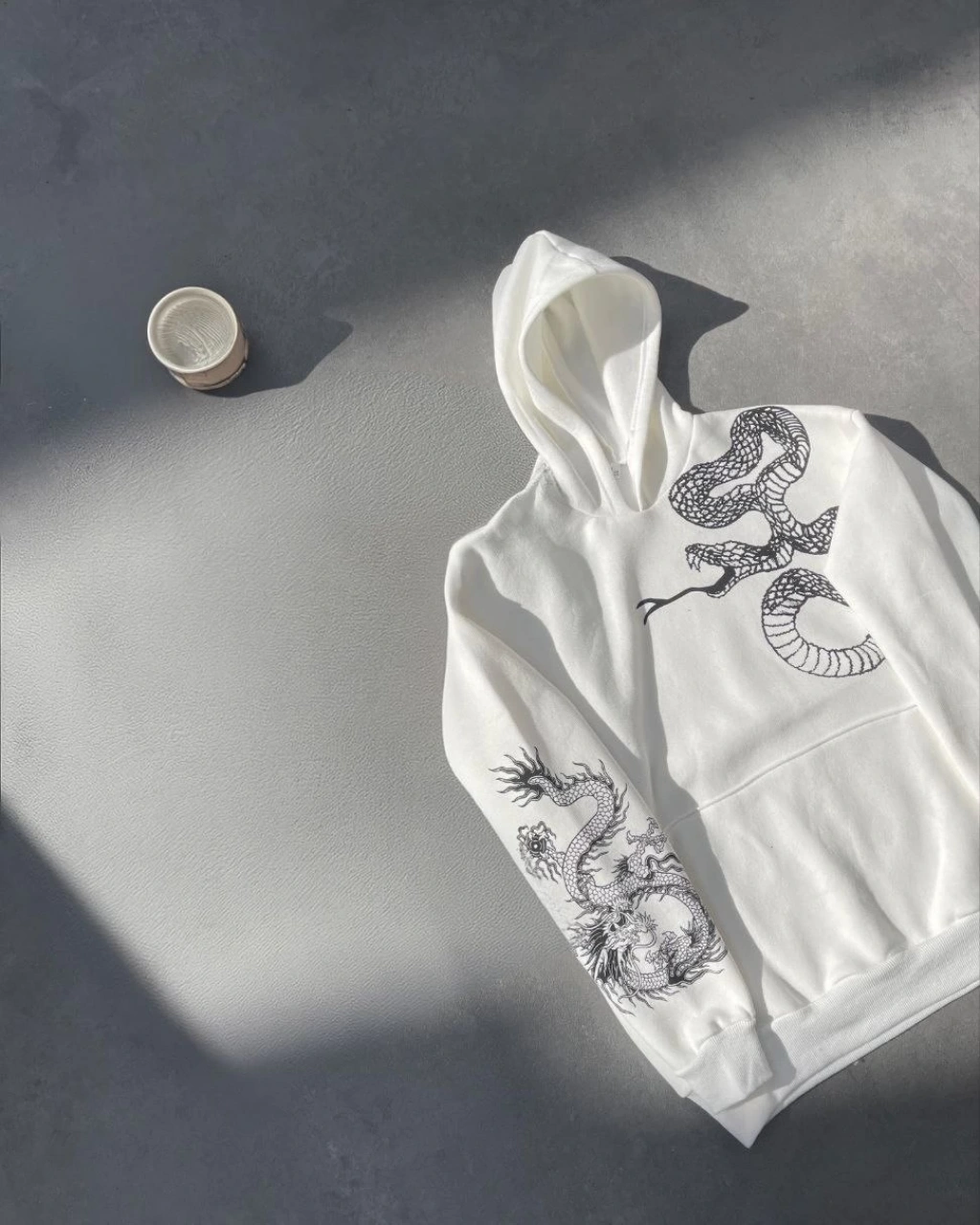 Unisex Kapşonlu Baskılı Sweetshirt - Beyaz