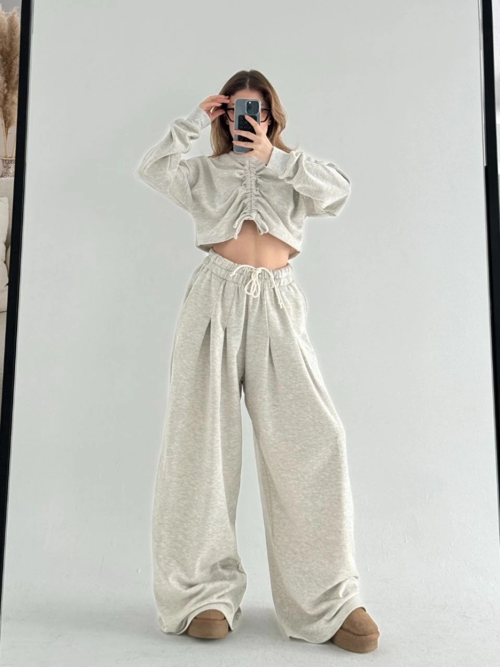 KADIN PREMİUM PARÇALI EŞOFMAN TAKIM - DİK YAKA FERMUARLI SWEATSHİRT - GRİ