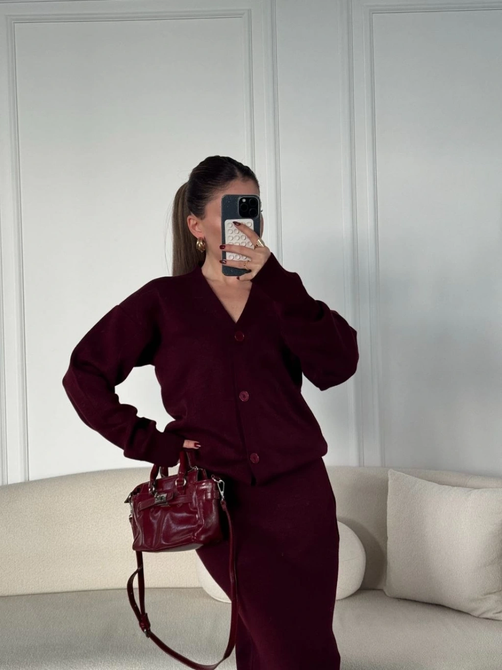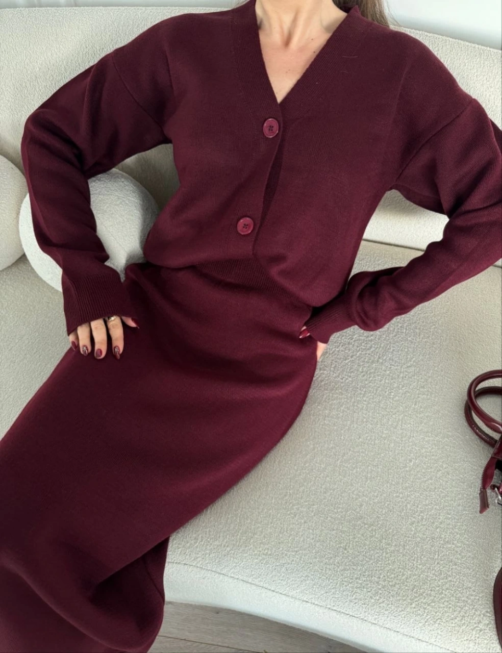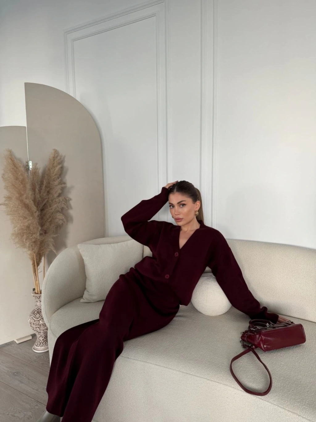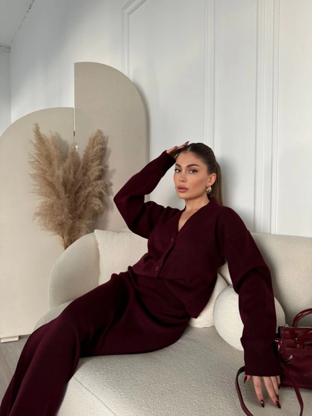 Osy Modal Yumuşak Dokulu Kumaş Bisiklet Yaka T-shirt Bol paça Pantalon ikili Takım -Bordo
