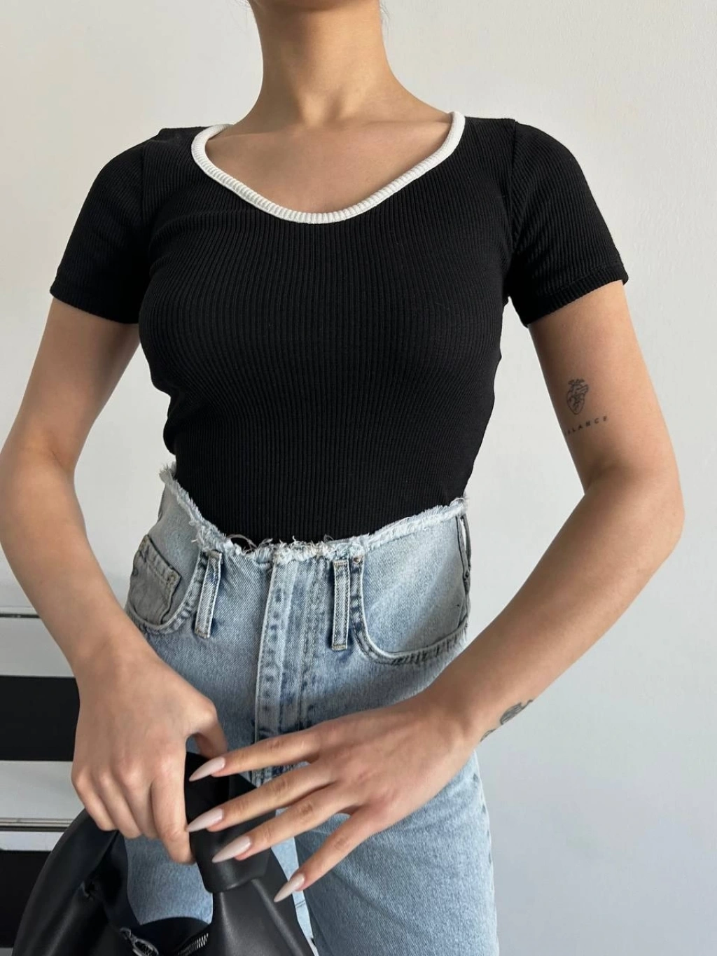 V yaka kol ve yaka düğmeli bluz siyah A4047