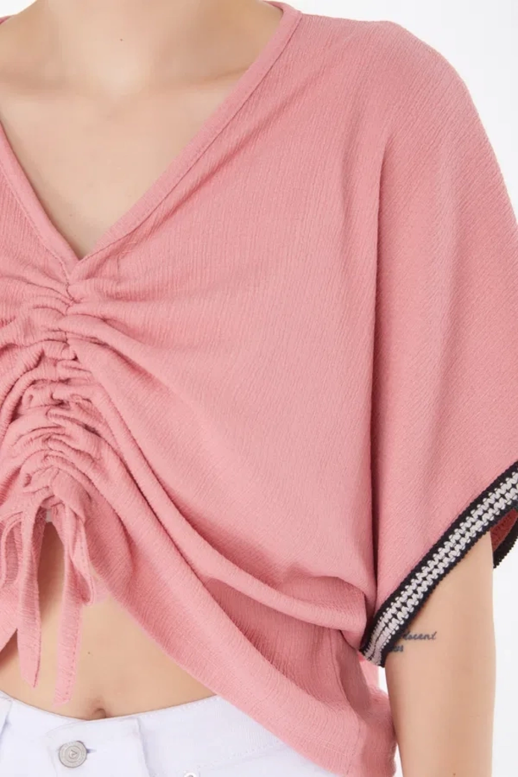 KAZAX markasının şıklığı ve rahatlığı bir araya getiren V yaka büzgülü detaylı bluz, gardırobunuzun vazgeçilmezi olmaya aday.