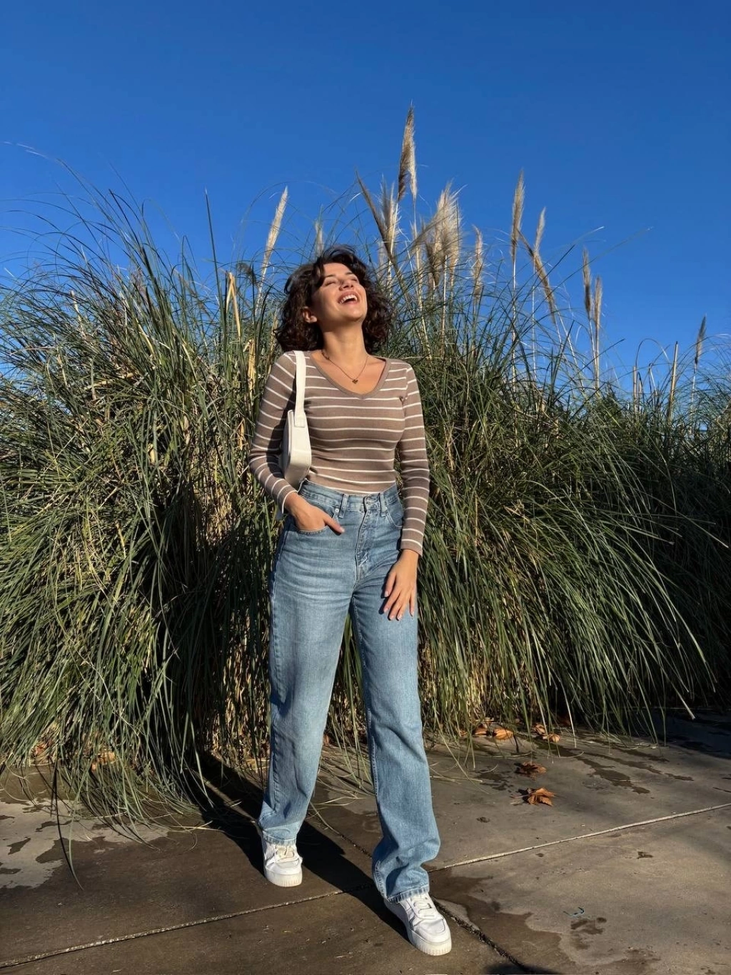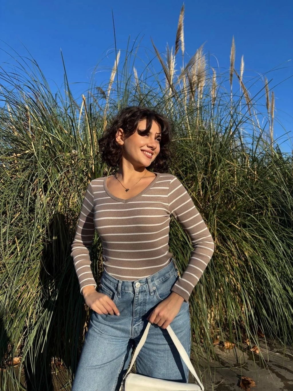 Çizgili madonna yaka kaşkorse bluz bej a844