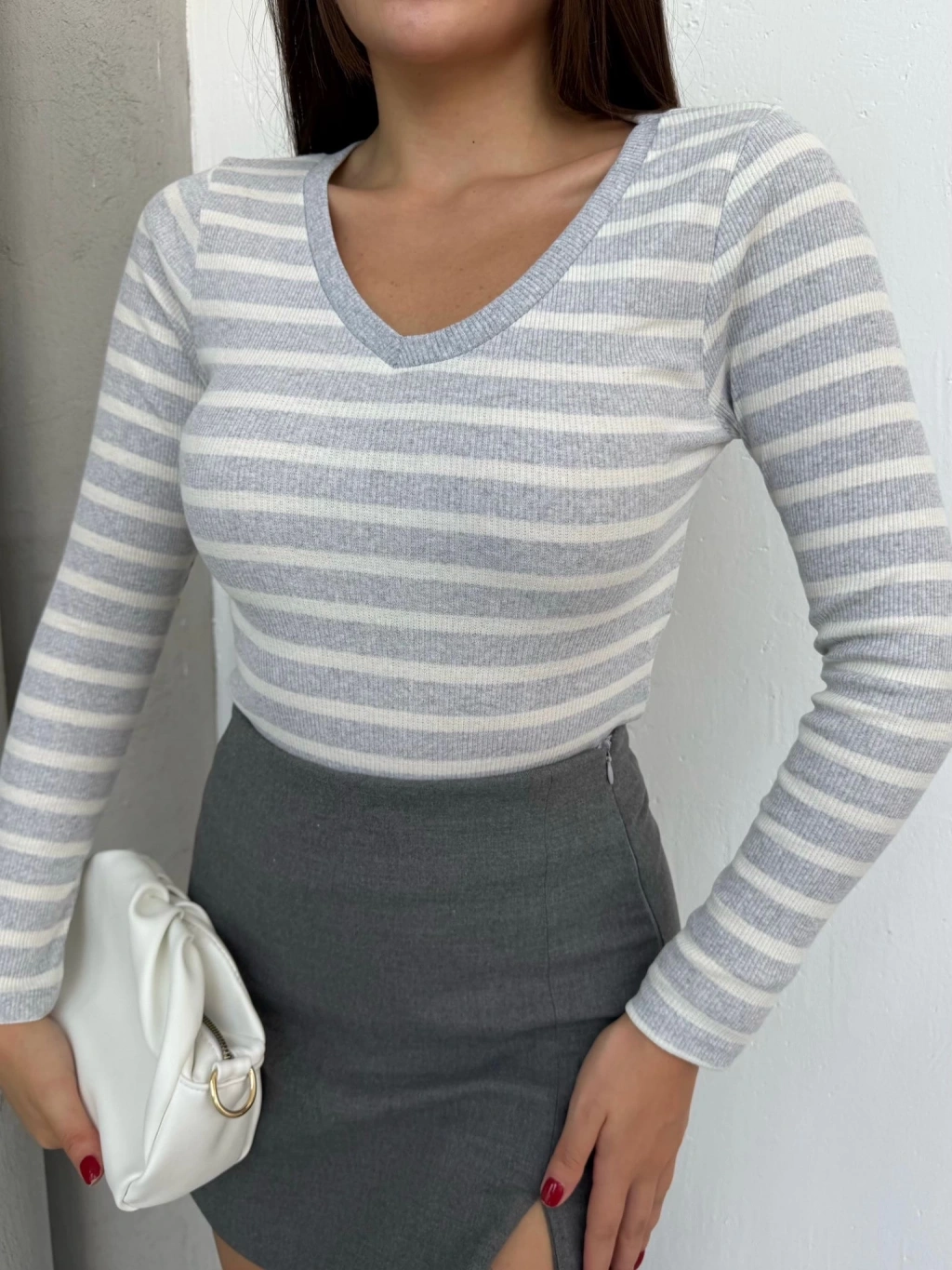 • V yaka çizgili bluz gri A3699
