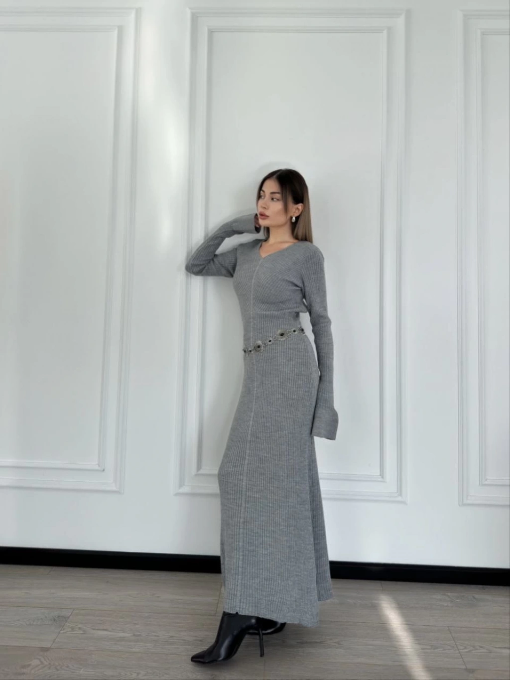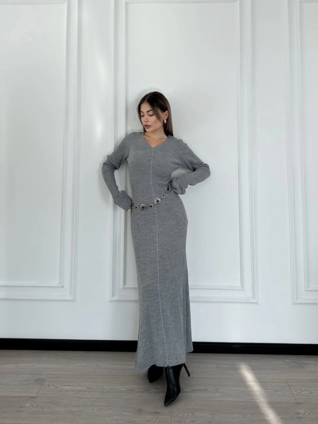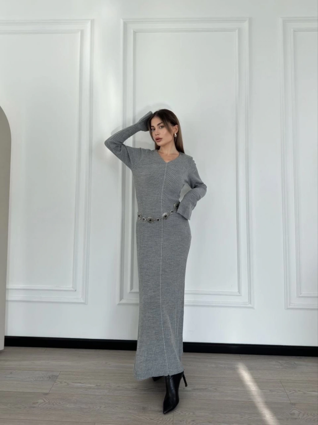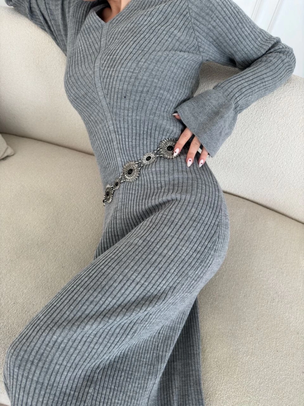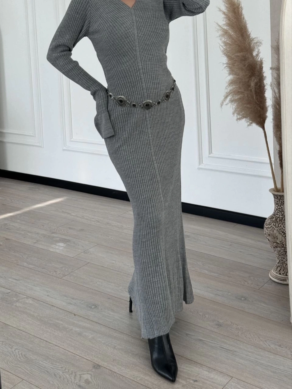 Kadın Tesettür Triko Elbise – Boğazlı Uzun Fitilli Dokuma, Esnek Tam Kalıp, 130 cm Midi Boy, Bahar & Kış Şık Rahat Stil - Kahverengi