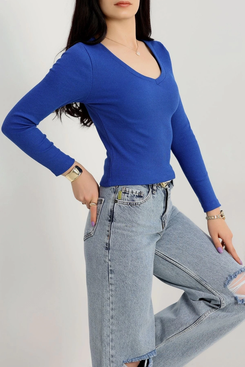 Kayık yaka uzun kollu bluz lacivert pt