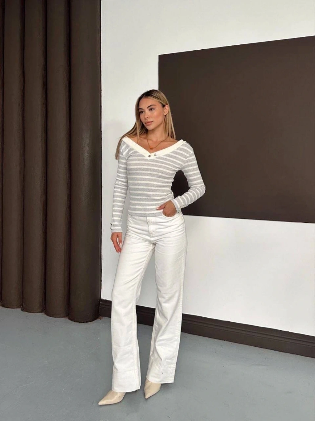 Çizgili madonna yaka kaşkorse bluz beyaz a844