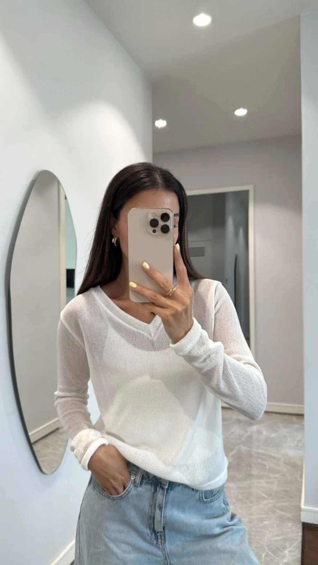 Keten Uzun Kol Bağacık Detaylı Bluz - Beyaz
