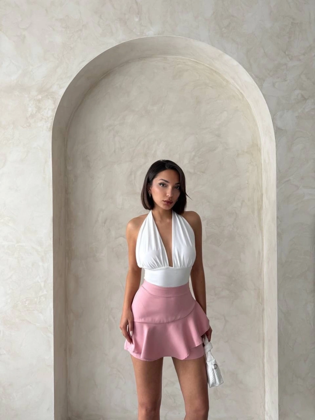 İki düğmeli kaz ayağı desen ch kumaş şort etek beyazturuncu h26414