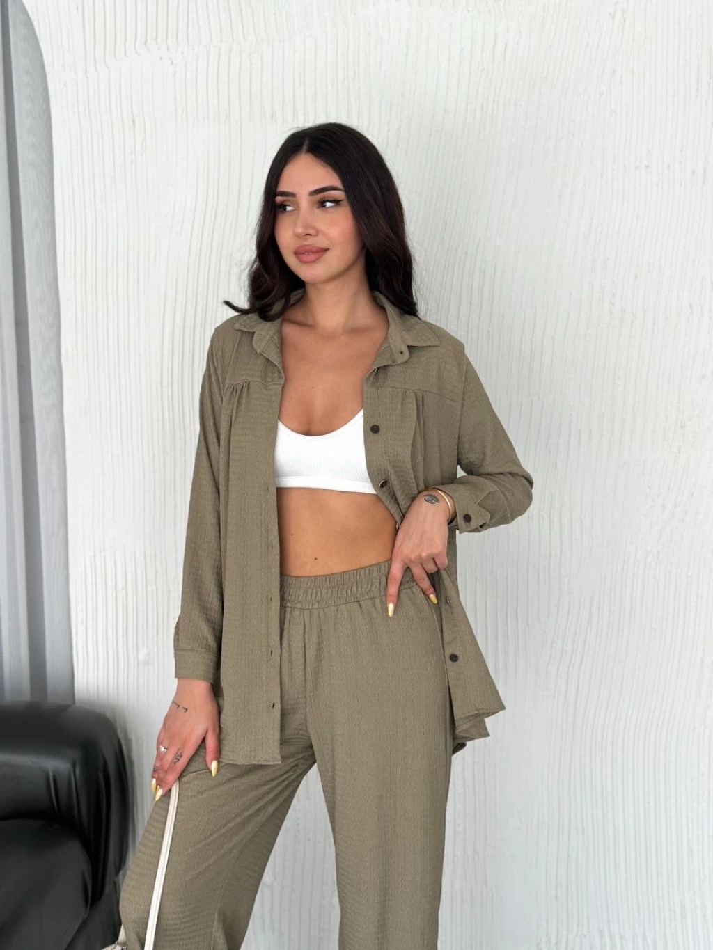 KADIN KADİFE OVERSİZE TAKIM – GÖMLEK VE PANTOLON İKİLİ SET FÜME CORDUROY ŞIKLIĞI, RAHAT VE ZARİF DURUŞ YUMUŞAK DOKULU KADİFE KUMAŞ, DÜĞMELİ GÖMLEK ÜST VE LASTİKLİ PANTOLON ALT PARÇA İLE GÜN BOYU KONFOR- HAKİ