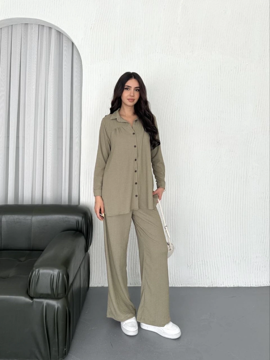 Kadın Kadife Oversize Takım – Gömlek ve Pantolon İkili Set Füme Corduroy Şıklığı, Rahat ve Zarif Duruş Yumuşak Dokulu Kadife Kumaş, Düğmeli Gömlek Üst ve Lastikli Pantolon Alt Parça ile Gün Boyu Konfor- haki