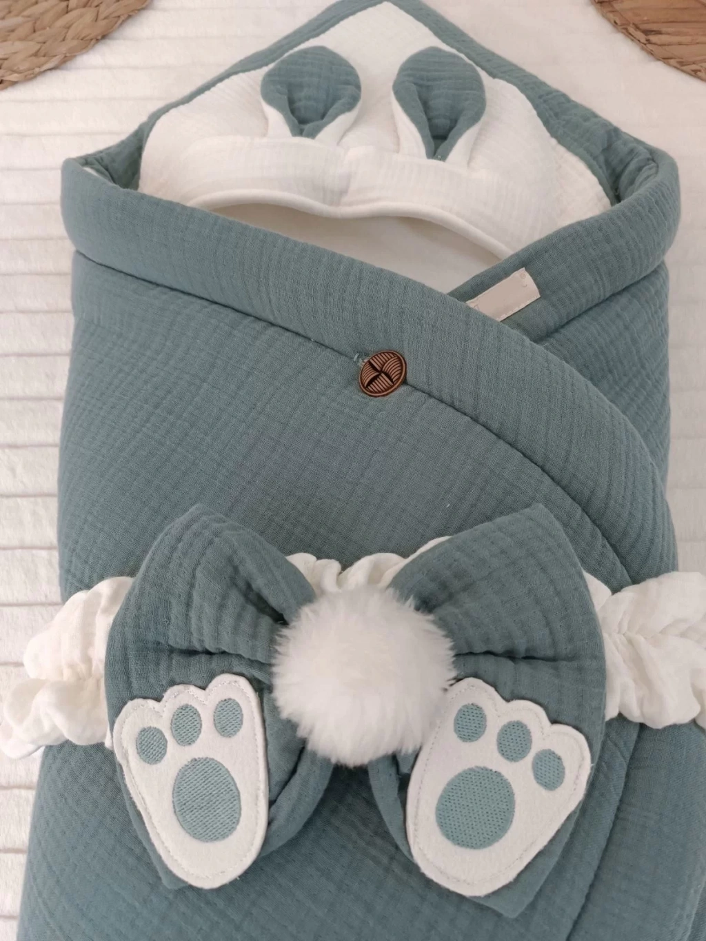 Yenidoğan 4 Kat Müslin Kumaş Kulaklı Patili Fiyonk Bebek Battaniyesi Kundak Kahverengi