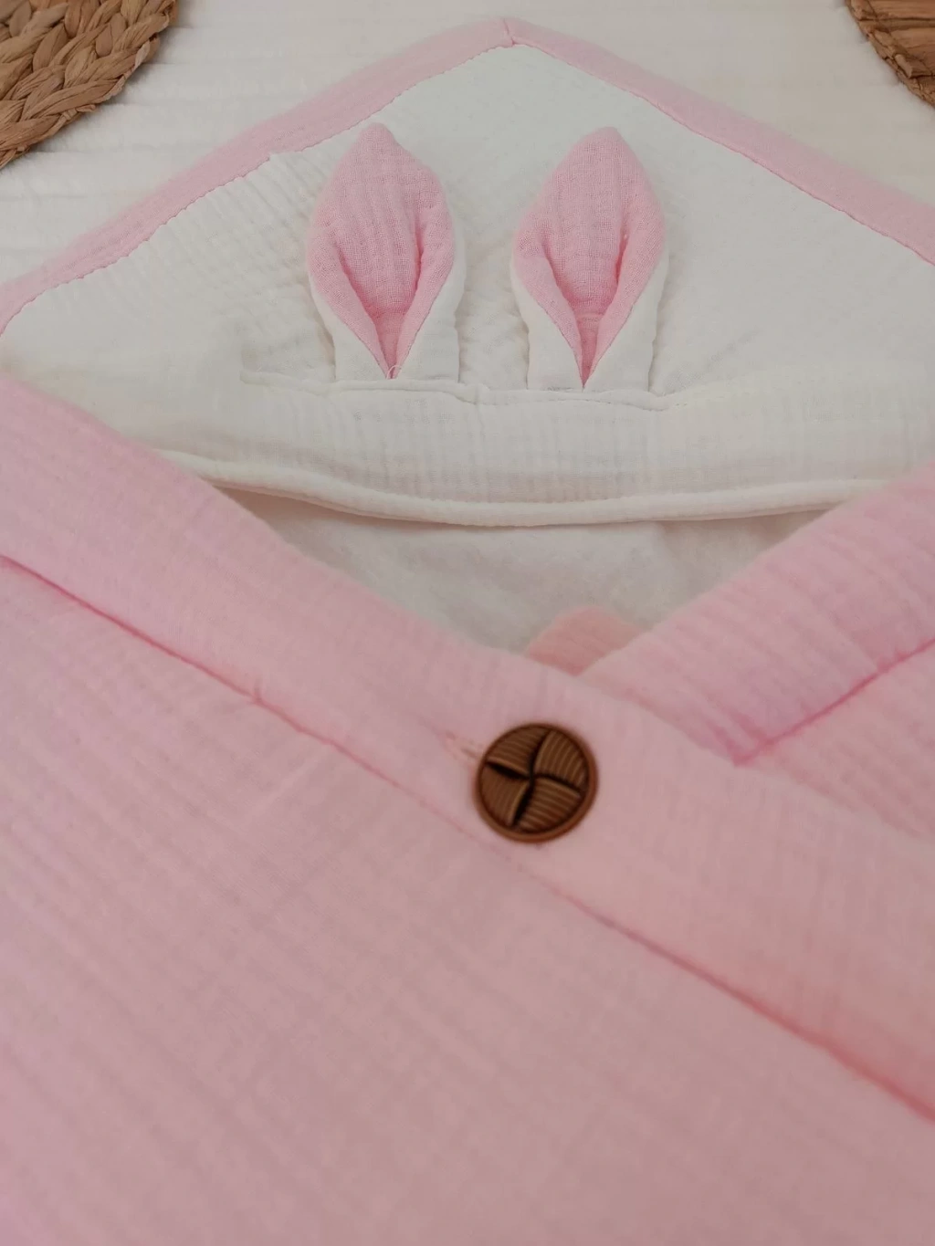 Yenidoğan 4 Kat Müslin Kumaş Kulaklı Patili Fiyonk Bebek Battaniyesi Kundak Pembe