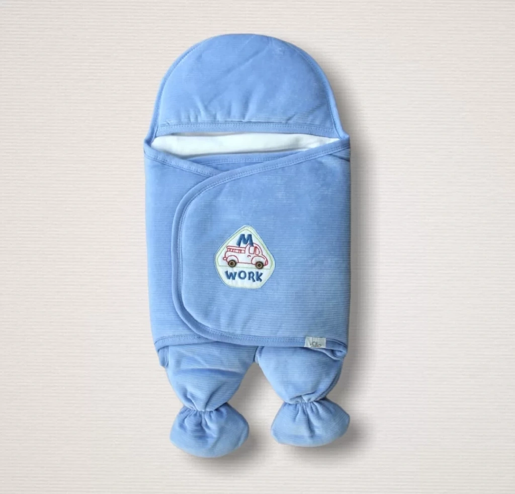 Yenidoğan Araba Nakışlı Fitilli Kadife Ayaklı Erkek Bebek Kundak Mavi