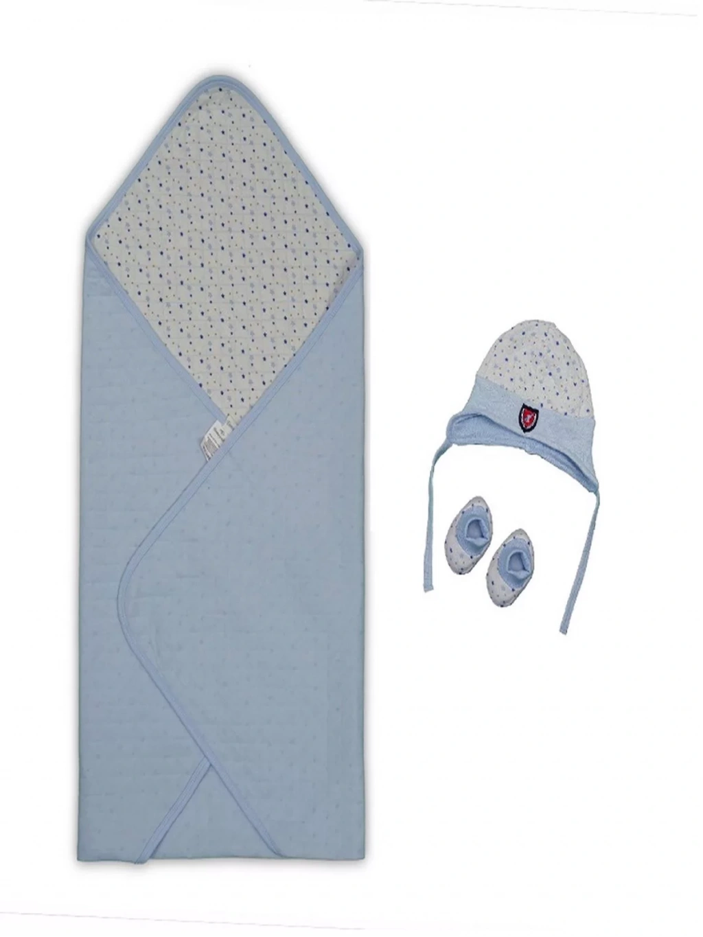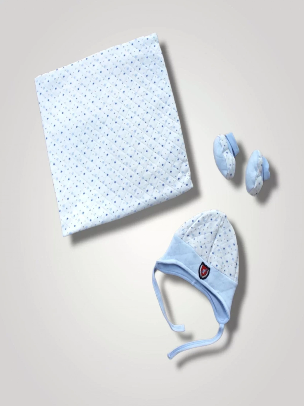 Yenidoğan Baskılı Double Face Şapka Ve Patikli 3lü Bebek Battaniye Takımı Mavi
