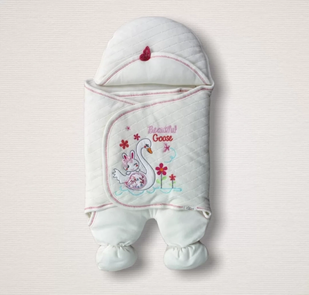 Yenidoğan Çiçekli Ördek Nakışlı Şapkalı Kız Bebek Ayaklı Kundak Bebek Battaniyesi Ekru