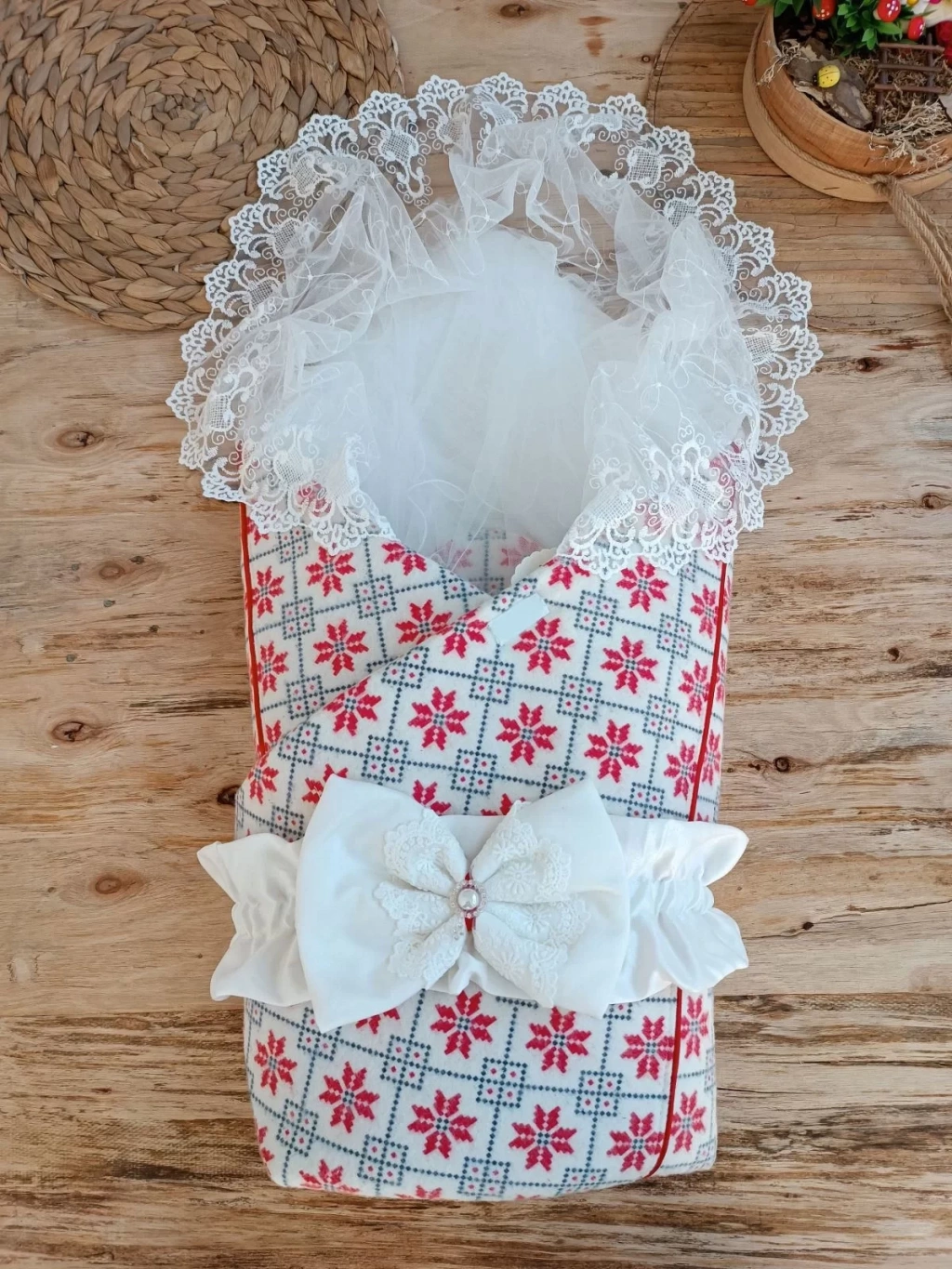 Yenidoğan Kar Tanesi Desenli Dantelli Duvaklı Bebek Battaniyesi Kundak Ekru