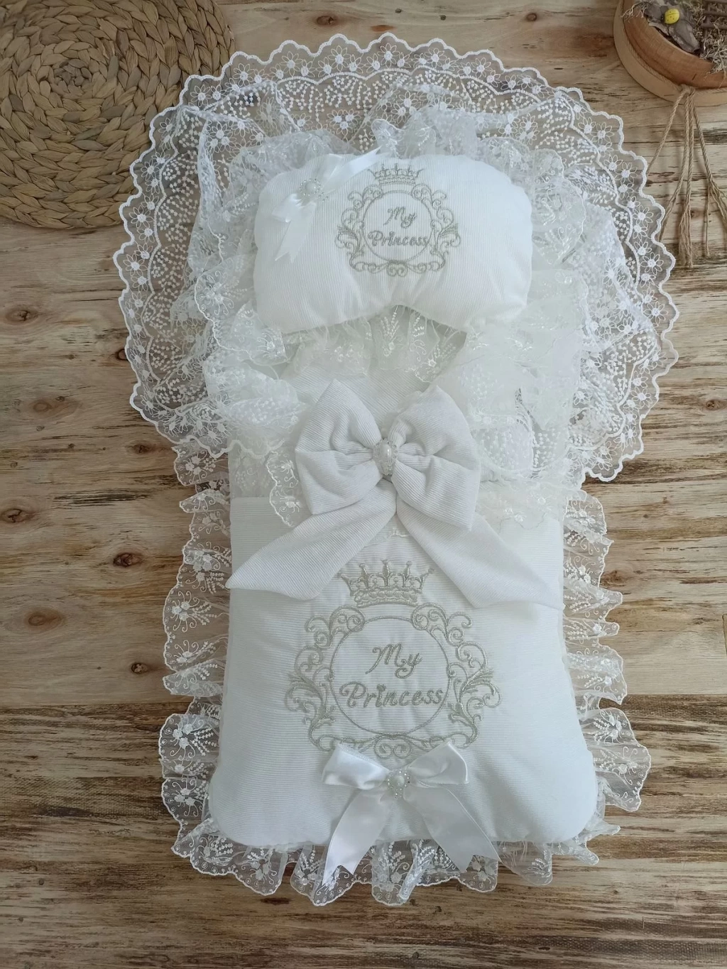 Yenidoğan Nil Nakışlı Hayal Güpürlü Trilüks Kundak Bebek Battaniyesi 3lü Alt Açma Seti Bej