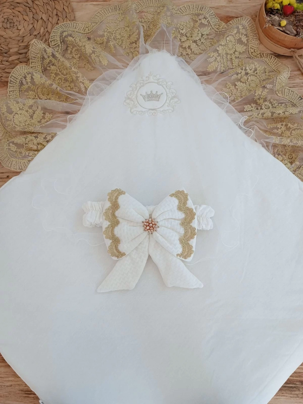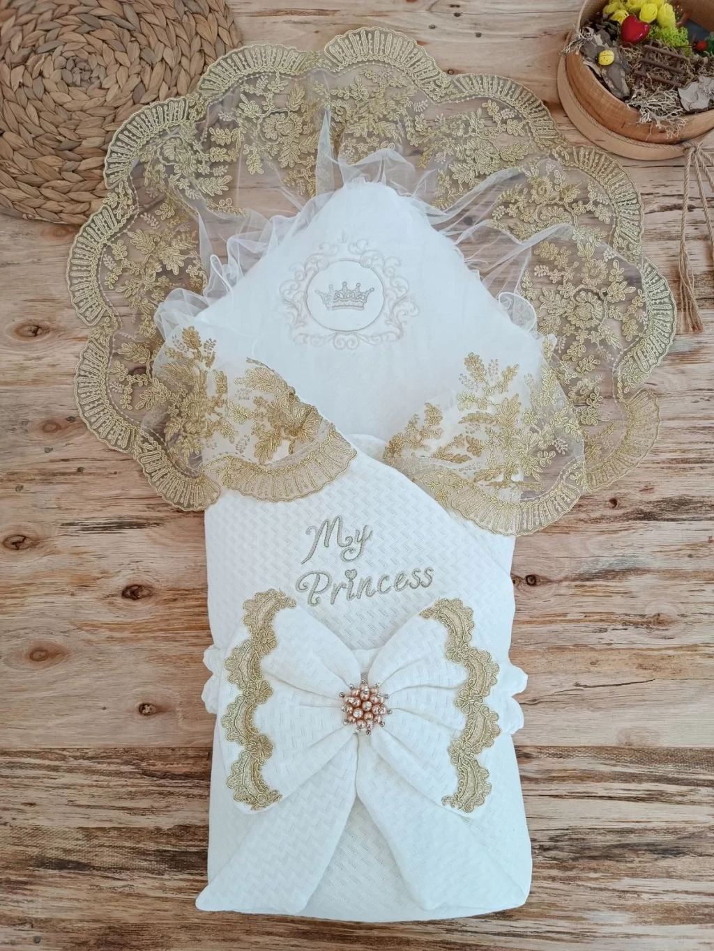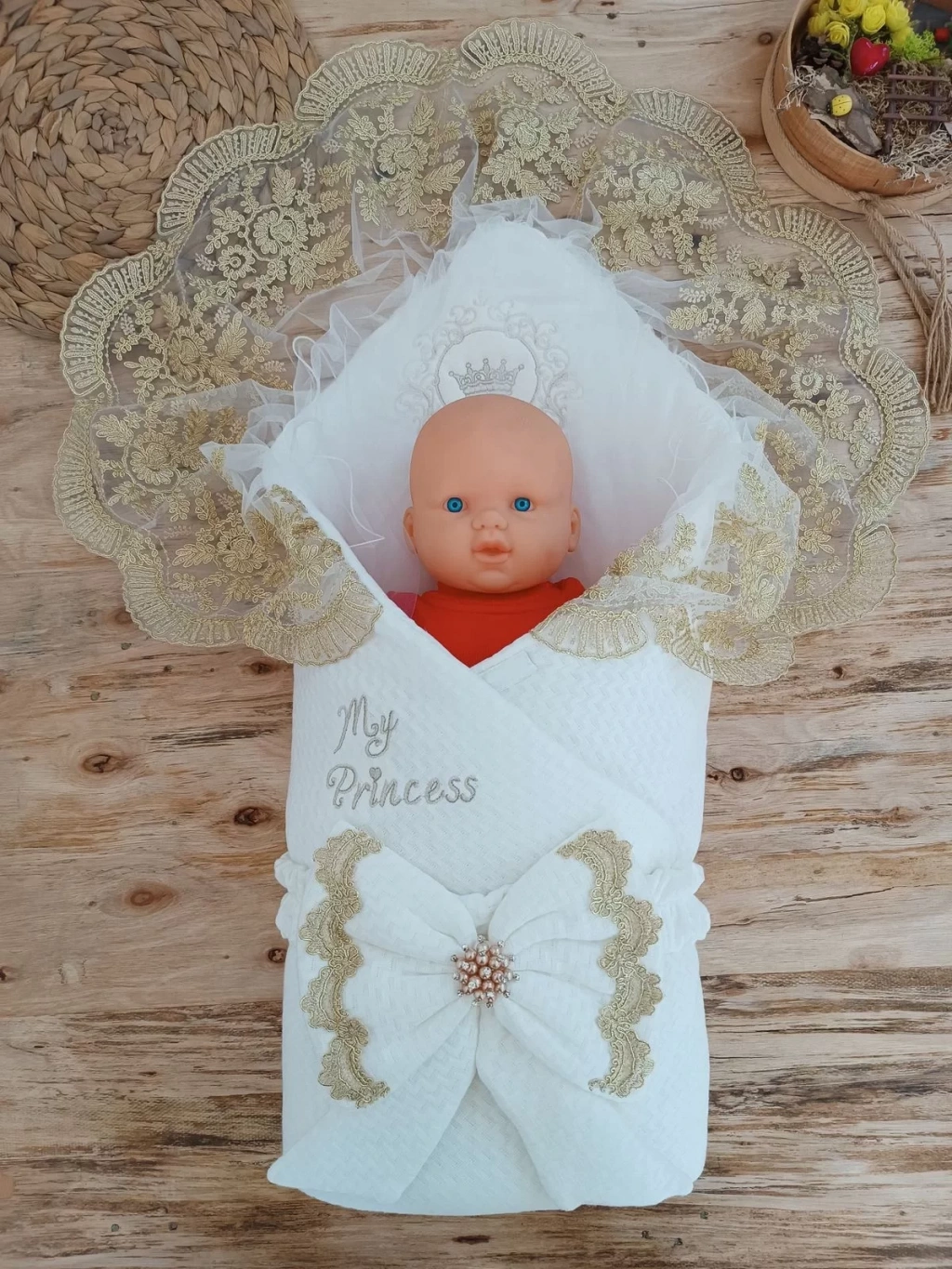 Yenidoğan Pamuk Benim Prensesim Nakışlı Trilüks Kundak Bebek Battaniyesi Ekru