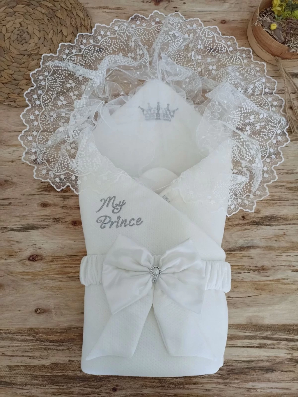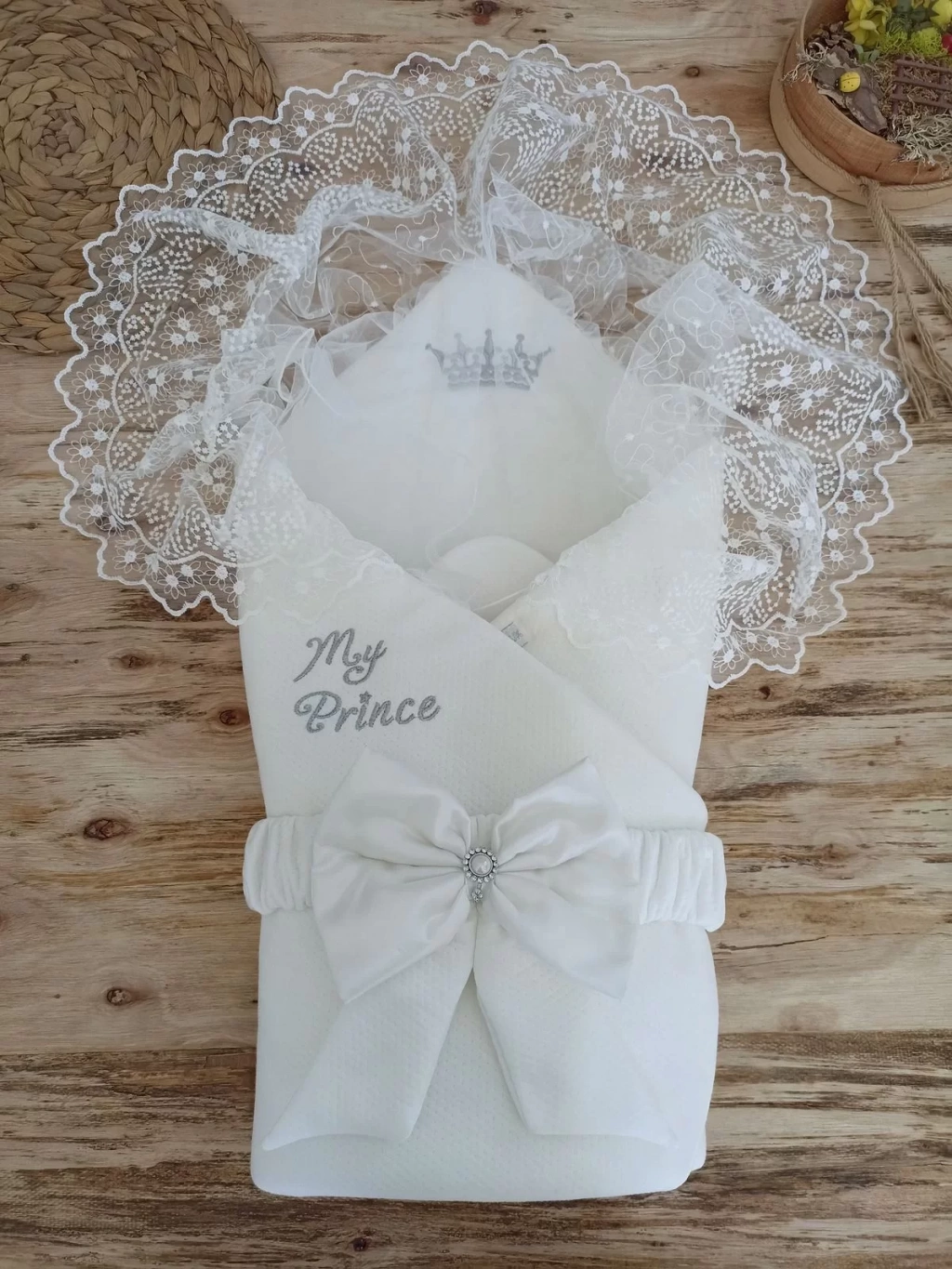 Yenidoğan Sahra Benim Prensim Nakışlı Kundak Bebek Battaniyesi Ekru