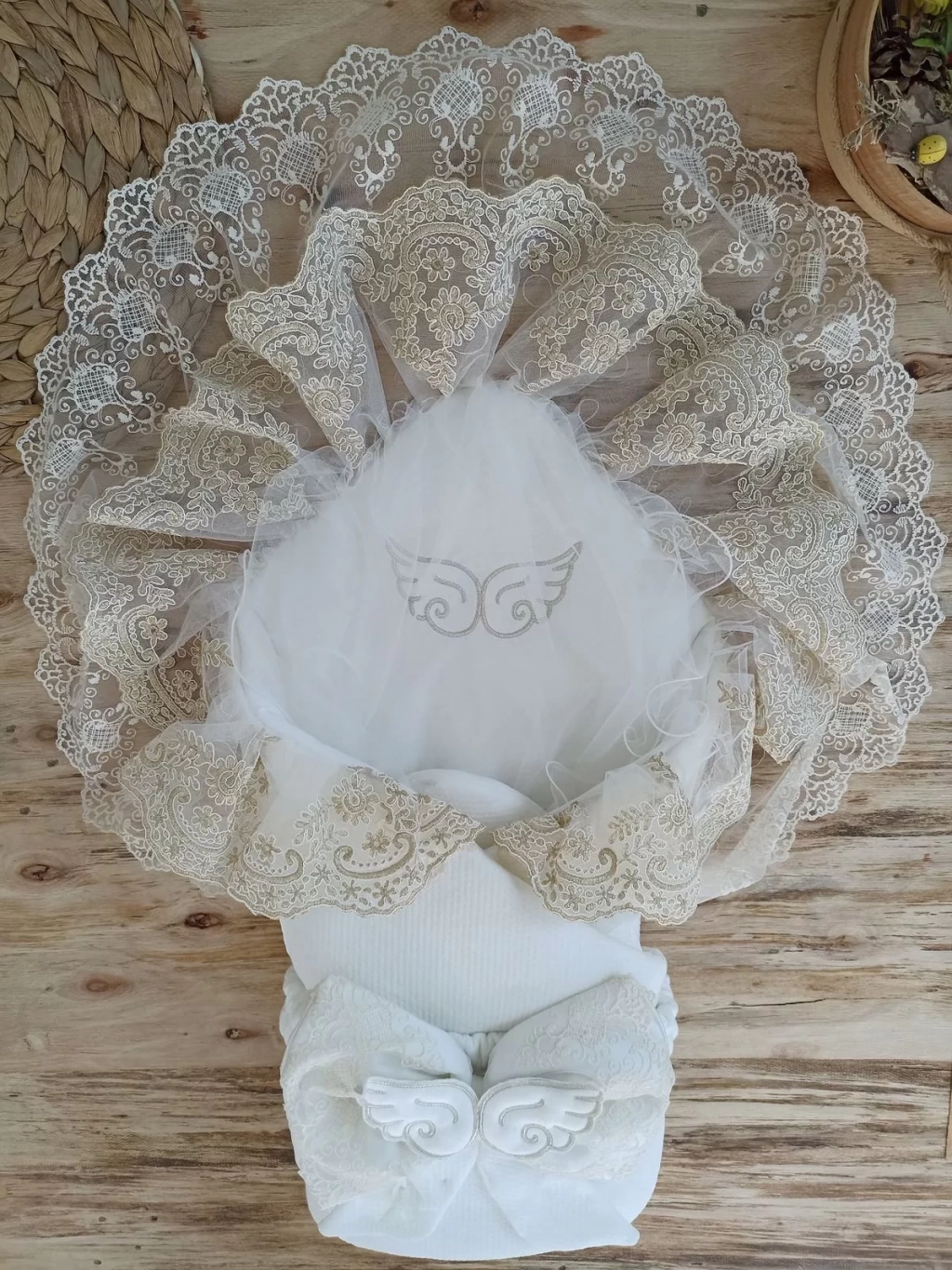 Yenidoğan Sahra Nakışlı Gold Angel Trilüks Kundak Bebek Battaniyesi Ekru