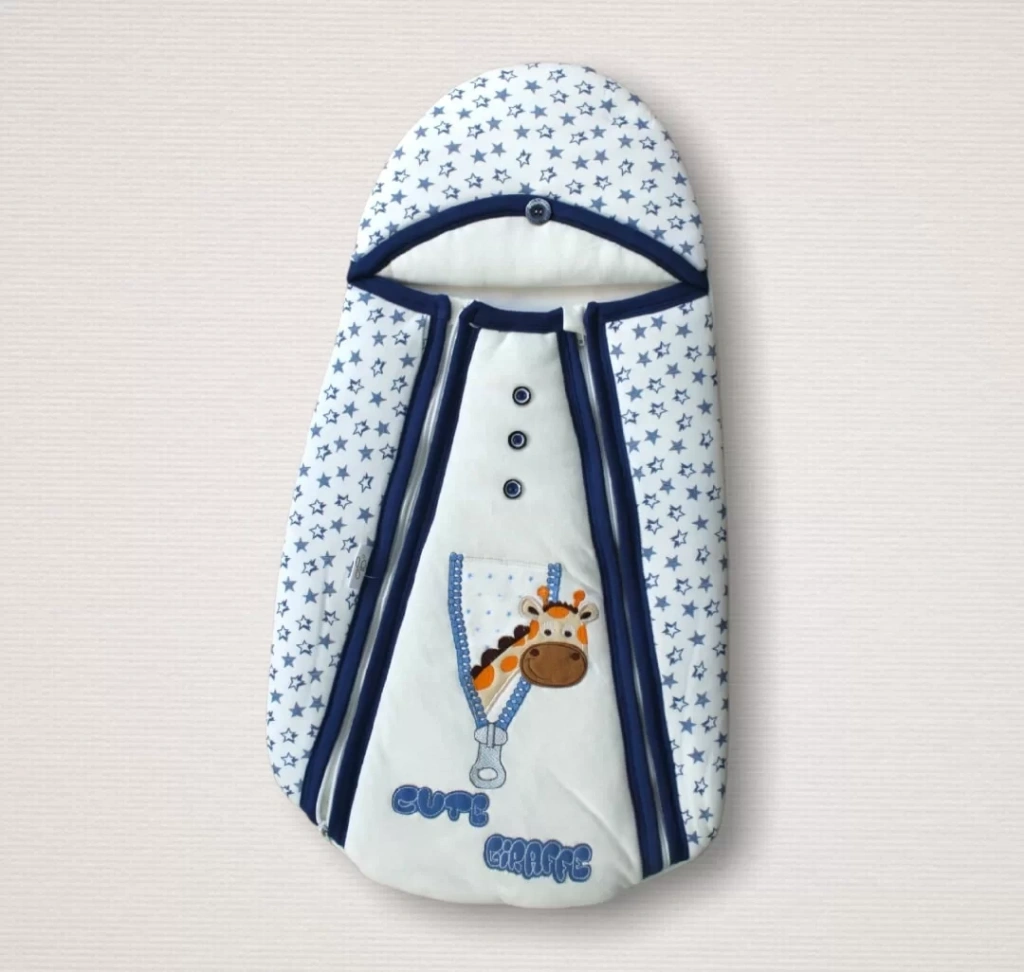 Yenidoğan Zürafa Nakışlı Çift Fermuarlı Erkek Kundak Bebek Battaniyesi Mavi