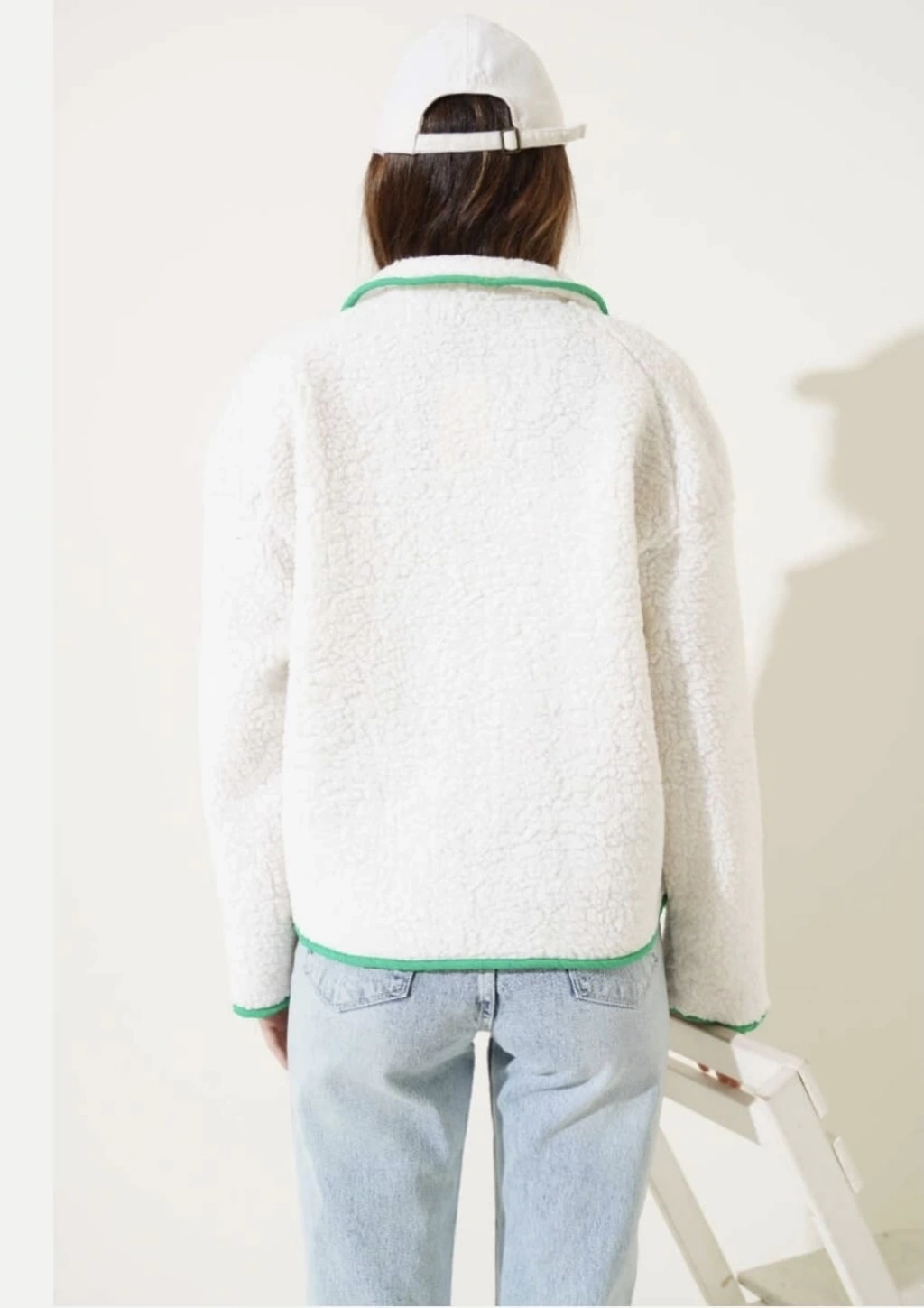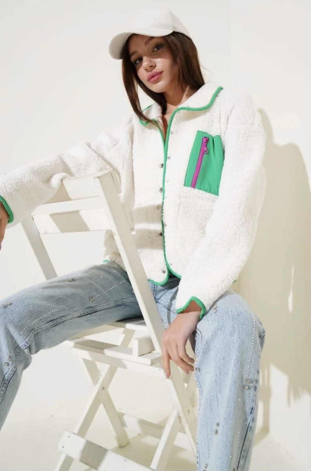 Yeşil Fermuar Cepli Kuzu Mont Beyaz T1085