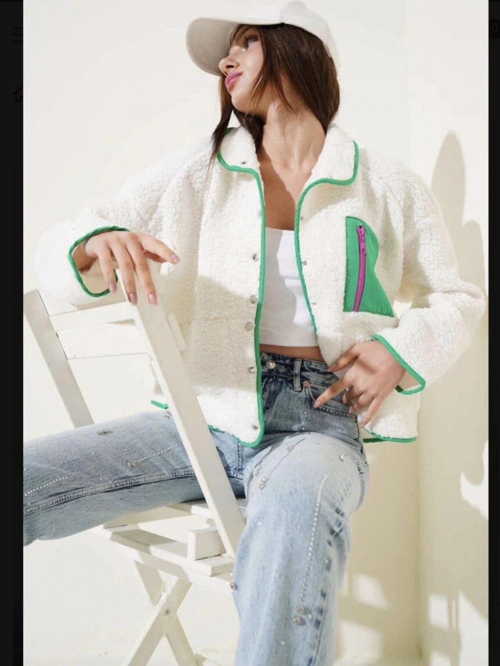 • Yeşil fermuar cepli kuzu mont beyaz t1085