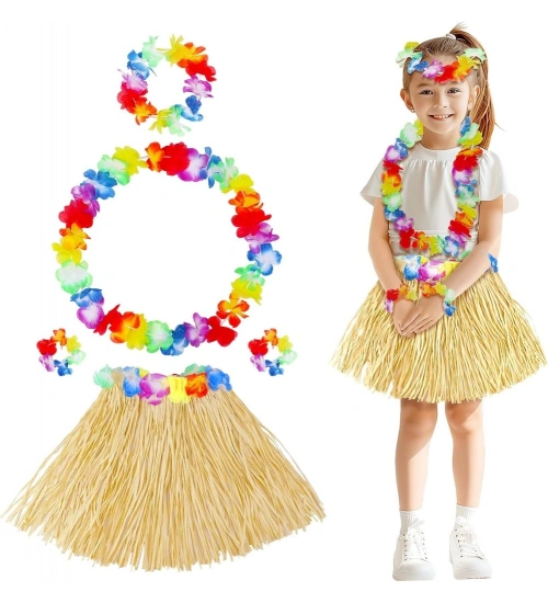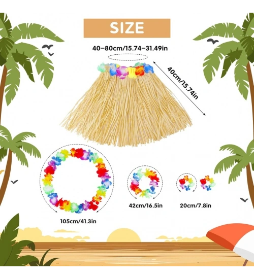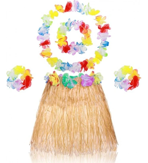 Yetişkin Çocuk Hawaii Parti Seti - 40 cm Naturel Etek + Çiçek Aksesuarlar (5 Parça) NessiWorld
