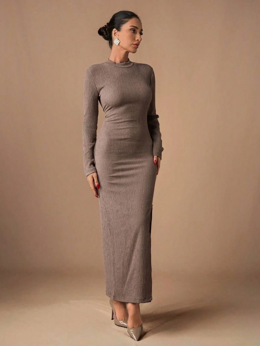 • Yırtmaçlı kalın bürümcük uzun elbise vizon