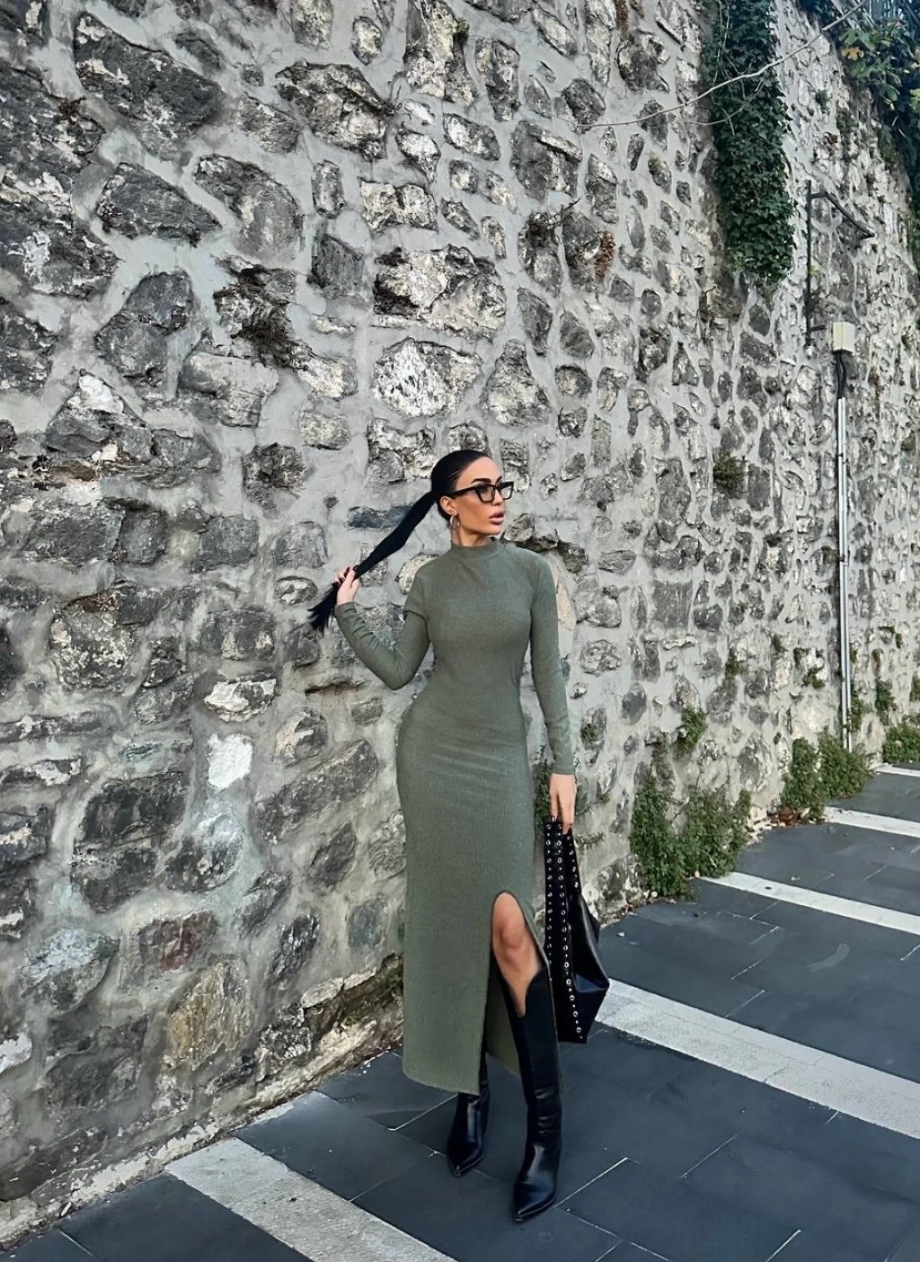 Fermuar detaylı fitilli şardonlu elbise bej a3178