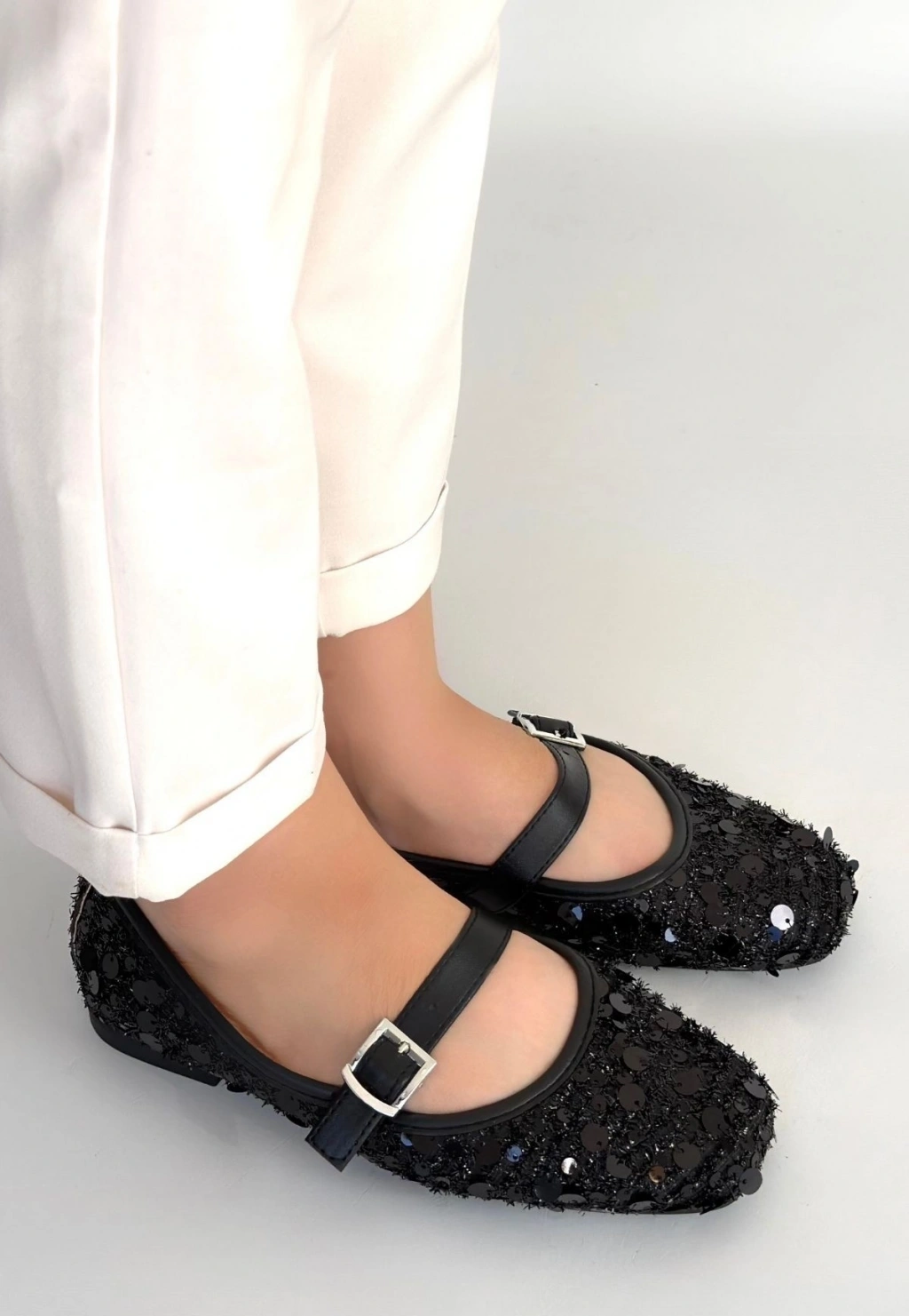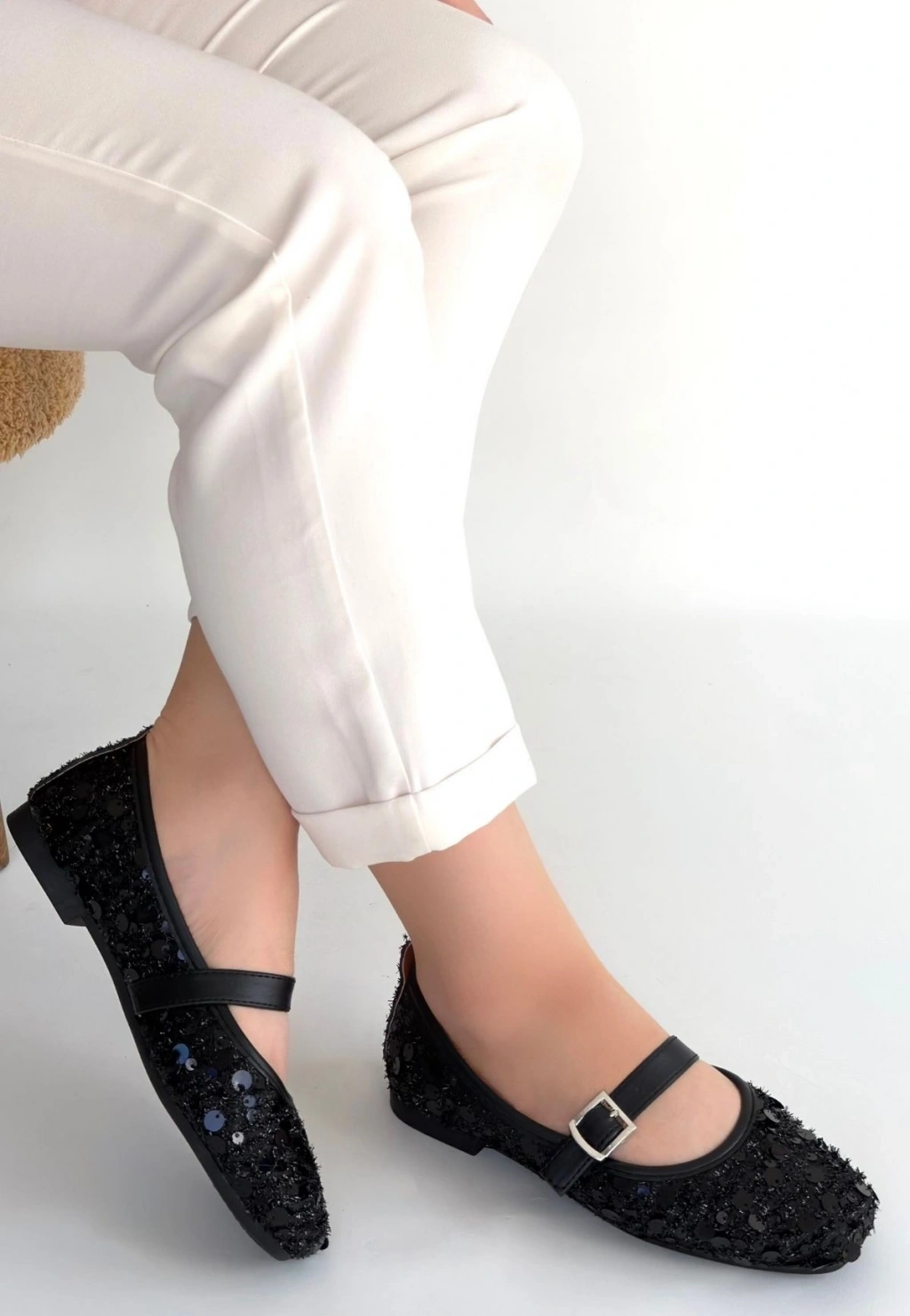 Zaty Siyah Süet Gümüş Pullu Babet Ayakkabı