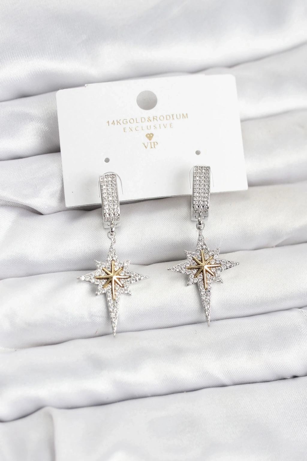 Zirkon Taşlı Gümüş Renk Pirinç Kutup Yıldızı Model Kadın Küpe